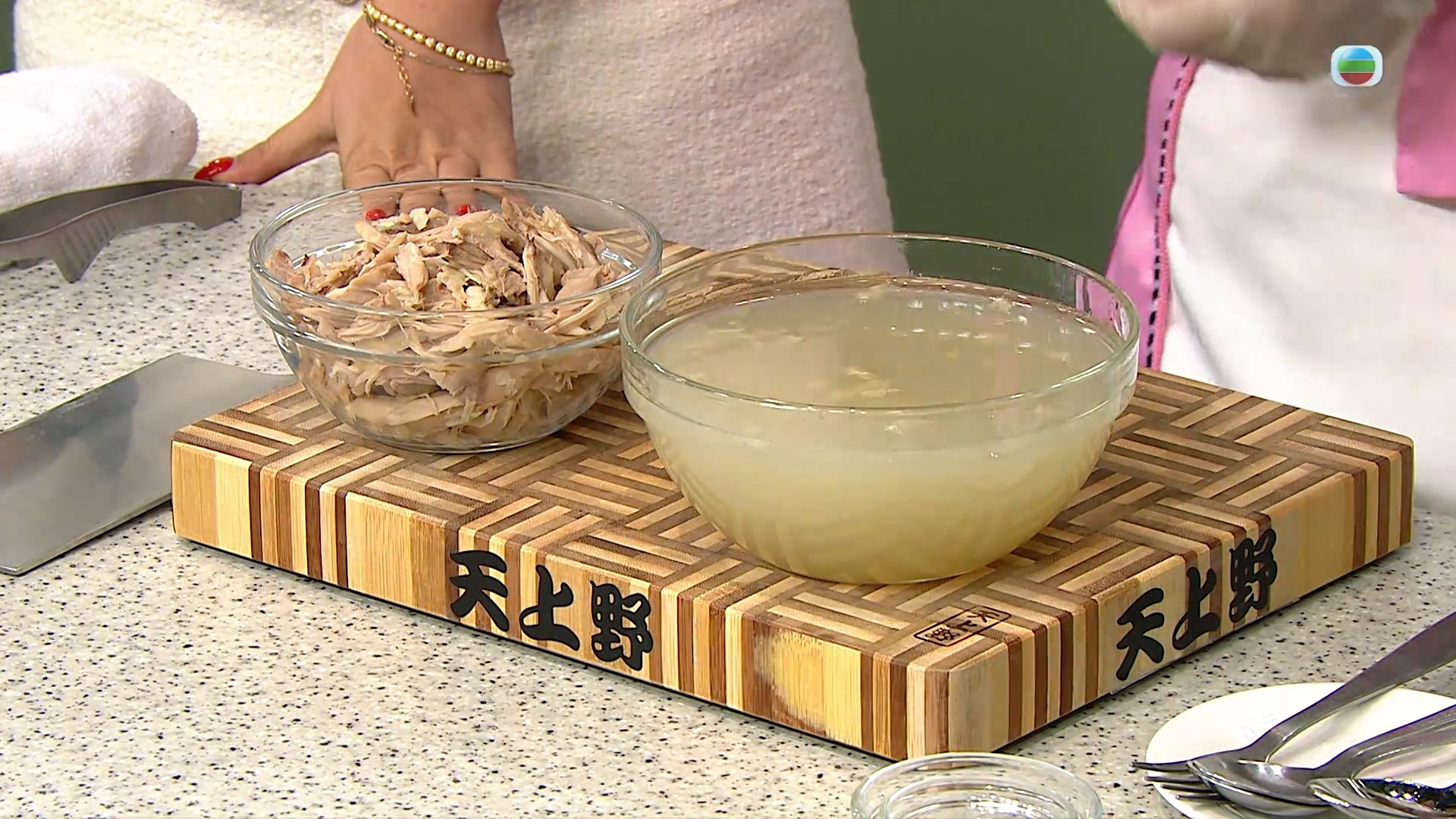 湯底以雞髀肉加薑片、蒜頭、香茅煮製,雞湯去掉浮面泡沫,雞髀起肉備用。