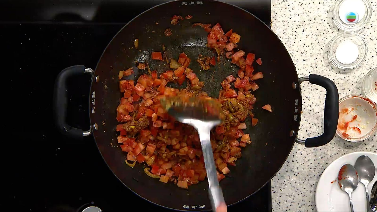 3.拌入小茴香粉、芫荽籽粉、茴香籽粉、薑黃粉、印度馬莎拉香料、辣椒粉、茄膏炒香,加入番茄粒,將免治牛肉回鍋。