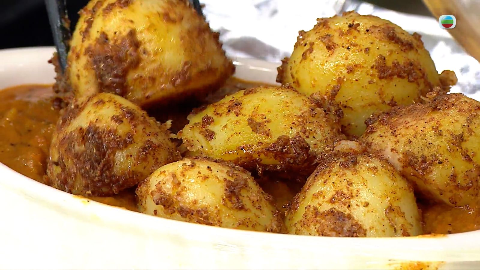 薯仔去皮切半,放入滾水內烚至半熟後撈起,加入印度馬莎拉香料、紅椒粉、鹽、牛油溶液拌勻,排放在咖哩牛肉上。