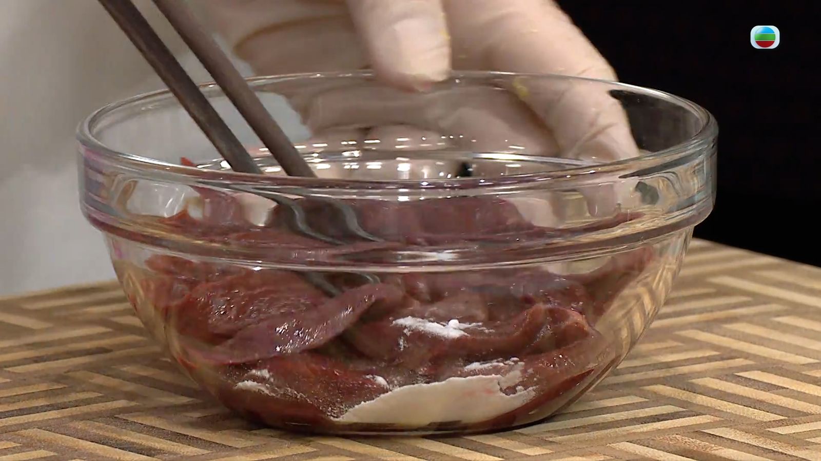 2.豬肝切塊並沖淨,放入食用梳打粉水內浸30分鐘,隔去水分,沖多幾次以去除血水,直至水變清,然後隔淨與(豬肝醃料)拌勻,待片刻。