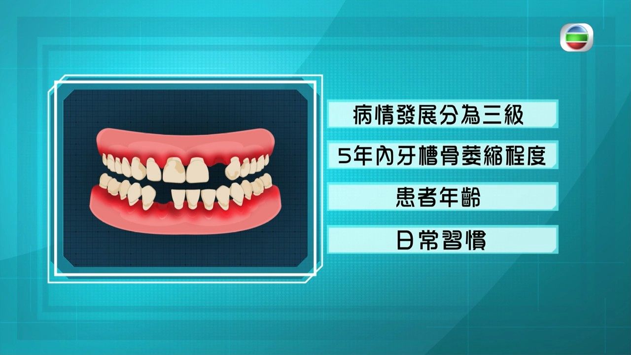 牙周病可因牙齦發炎、牙槽骨萎縮、牙齒脫落的情況而分為4期;亦可以按病情分為三級,包括5年內牙槽骨萎縮程度、患者年齡、日常習慣而判斷。本身緊附在牙腳表面的牙周韌帶會和牙腳分離,形成牙周袋;如果牙槽骨持續收縮嚴重,牙齒會移位,甚至脫落,影響進食能力。