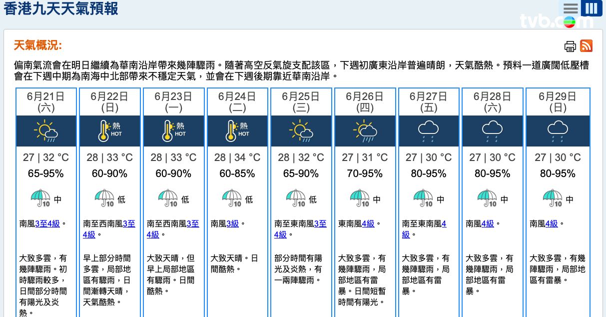 夏至天氣24節氣|周六(6月21日)是二十四節氣的夏至,本港將迎來炎熱周末。根據天文台九天天氣預報顯示,一股偏南氣流會在今明兩日繼續影響廣東沿岸,該區有幾陣驟雨,料今日市區最高氣溫約31度,明日(21日)為二十四節氣的「夏至」,料氣溫最高32度,部分時間有陽光及炎熱,有幾陣驟雨;預測周日(22日)起一連三日天氣酷熱,市區料升至33度。