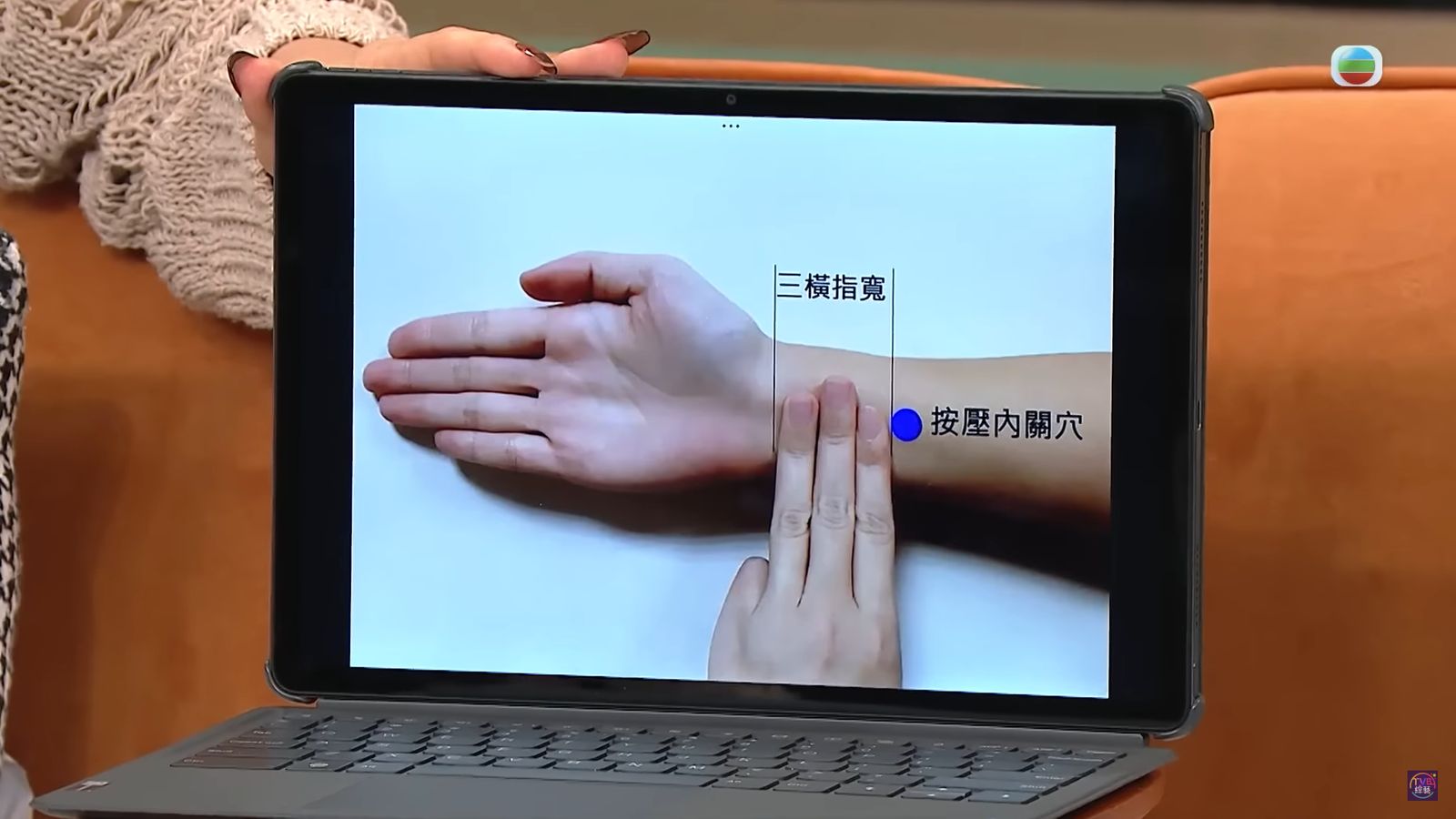 - 內關穴:手掌內側三指寬,左右兩側都可以按壓