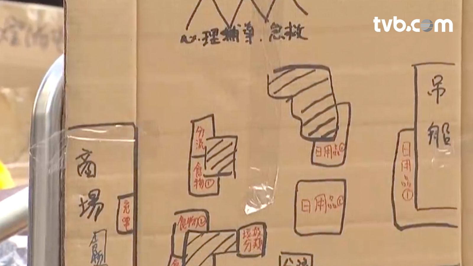 整個平台分了不同區域,放置不同種類物資,協助災民,包括熟食區、寵物用品區及衣物區等。有義工製作地圖,方便災民領取所需物件。現場又設有輔導站,幫助有需要市民。