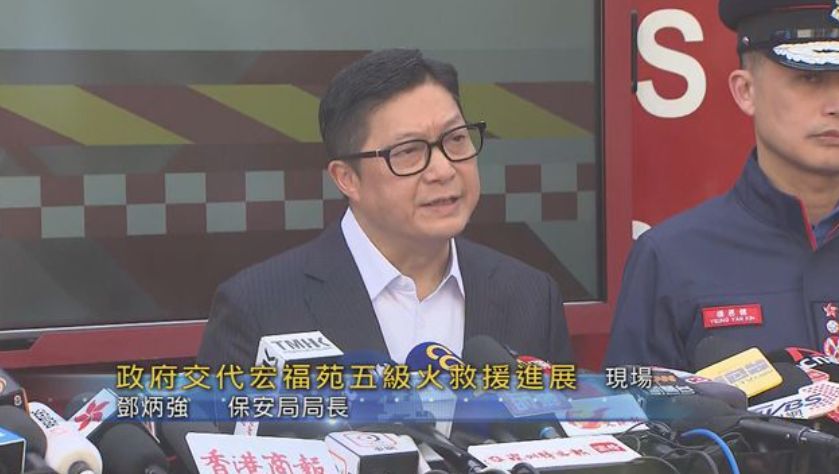 宏福苑五級火燃燒近三天,保安局局長鄧炳強指,高溫、雜物等多重困難,阻礙消防滅火救援工作。