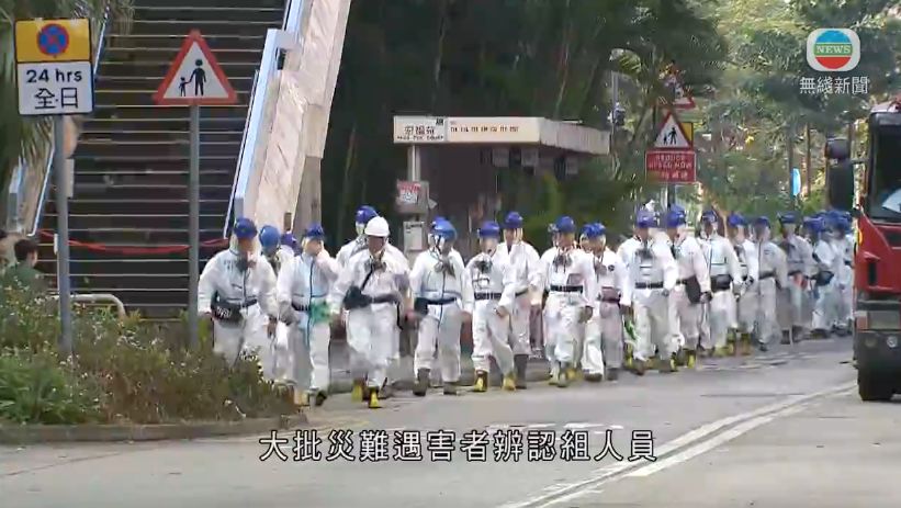 大批身穿全套保護衣物的災難遇害者辨認組人員,第三日到宏福苑搜索,多名消防人員亦到場調查。