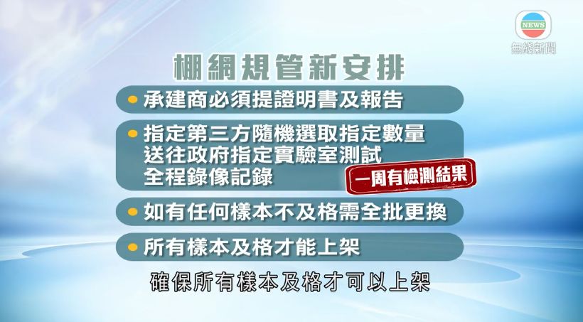 大埔宏福苑火災,揭露屋苑棚網連同阻燃證書都造假,繼全港大維修樓宇要拆除棚網後,發展局公布未來棚網上架的新安排。日後承建商必須提供棚網具阻燃效能的證明書, 棚網抵港後需安排指定第三方,隨機選取網的指定數量,送往政府指定實驗室測試。全程需要錄像記錄,目標一周有結果。