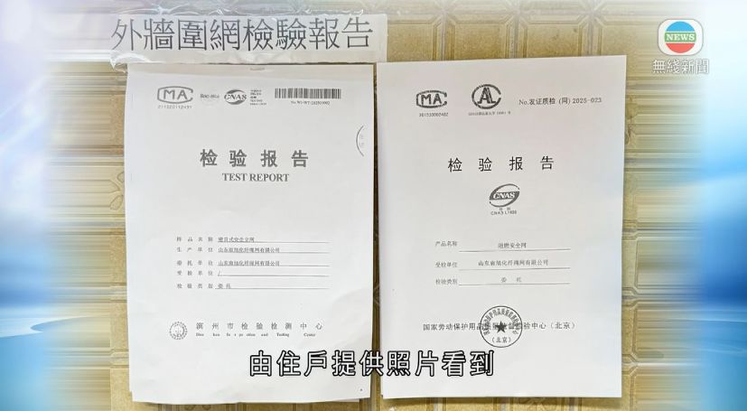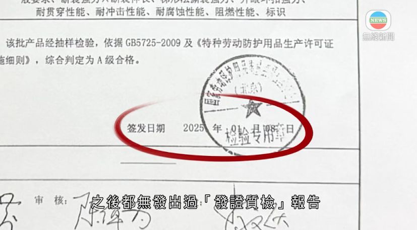 由住戶提供照片看到,其中一份報告是由「國家勞動保護用品質量監督檢驗中心(北京)」發出,右上角寫上「發證質檢」字樣,以及編號,簽發日期是2025年1月。本台記者打電話到北京求證,公司指2019年已改名,之後都無發出過「發證質檢」報告。