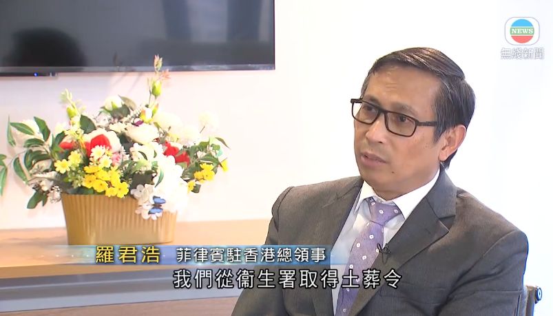 菲律賓駐港總領事羅君浩接受本台專訪時稱,大火時有43名菲傭在宏福苑工作,其中一人不幸罹難,遺下10歲兒子和年老母親。