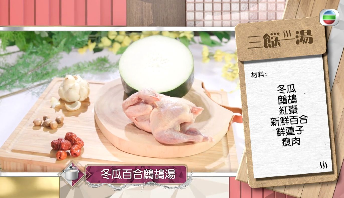 蕭秀香(三姐)曾在《三餸一湯》節目中,教大家煲冬瓜百合鷓鴣湯,這款湯水可以消暑祛濕之餘,仲可以化痰止咳,真的很適合夏天飲用。鷓鴣可以補氣、養血,蛋白質比雞肉高10.6%,而它的脂肪比雞低。重點是鷓鴣的膽固醇較低,所以十分有益!臨近大暑,不如就試試這款消暑湯水!