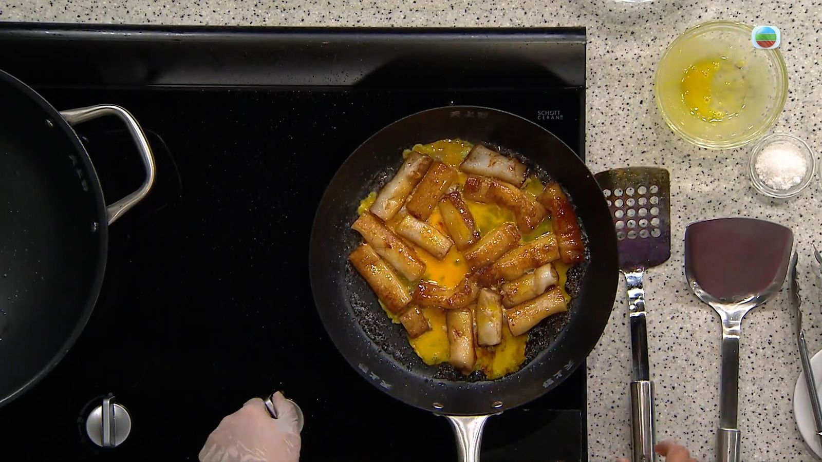 燒熱1湯匙蔥油,下腸粉煎至微黃後灒生抽、下蛋液,煎至定型就可以上碟。腸粉可以用素腸粉,也可以用帶蔥花或蝦米的。下腸粉前鍋一定要燒熱以免黏鍋。