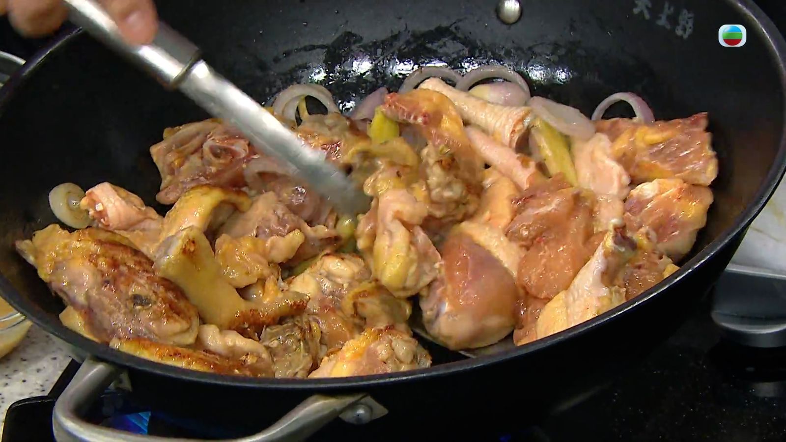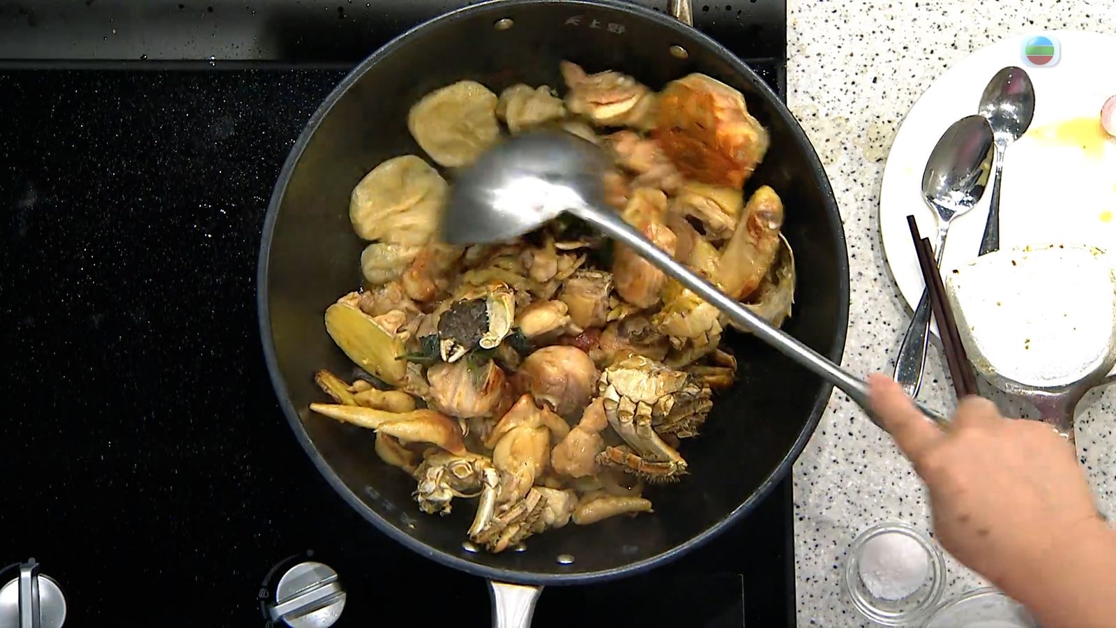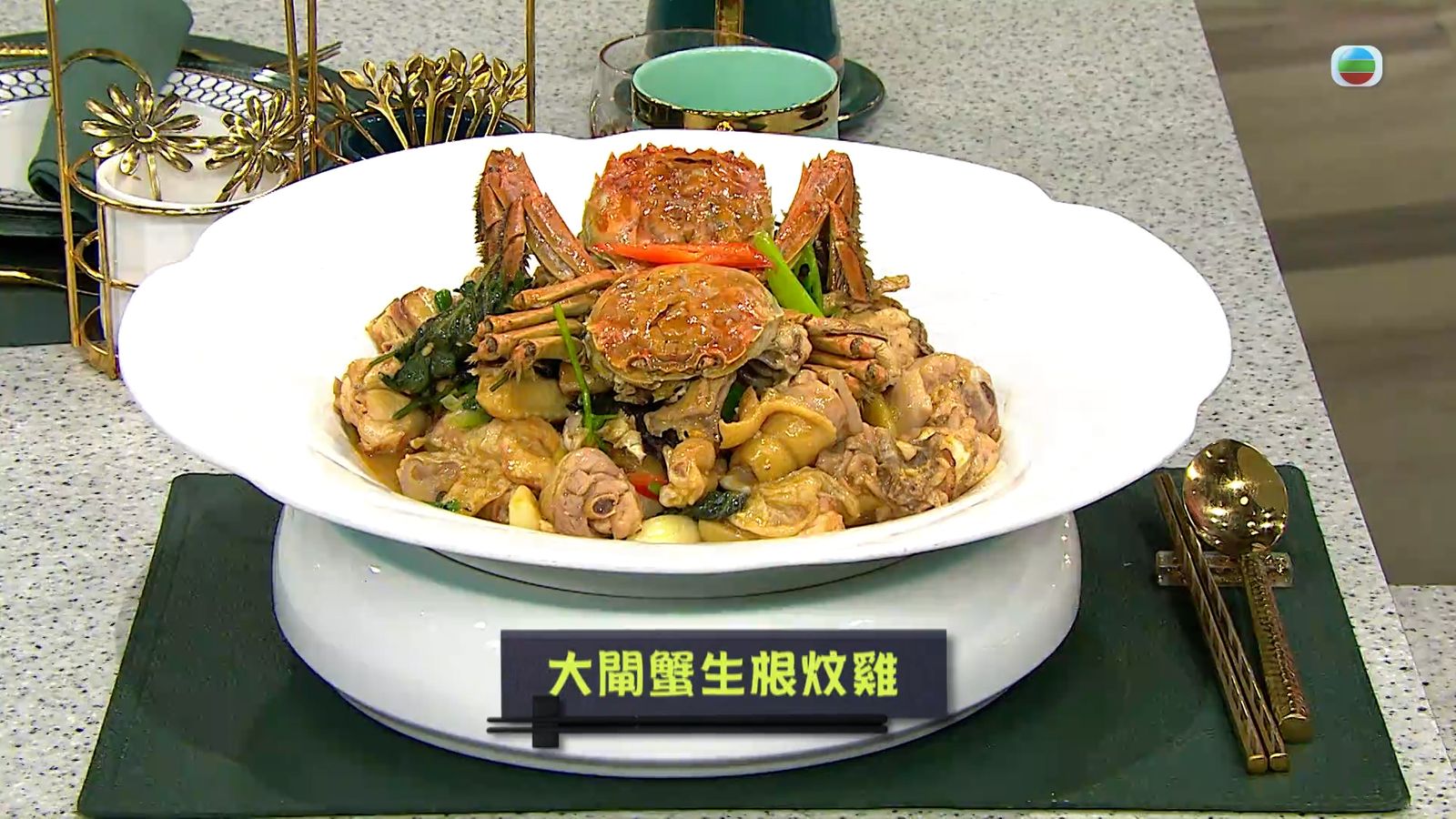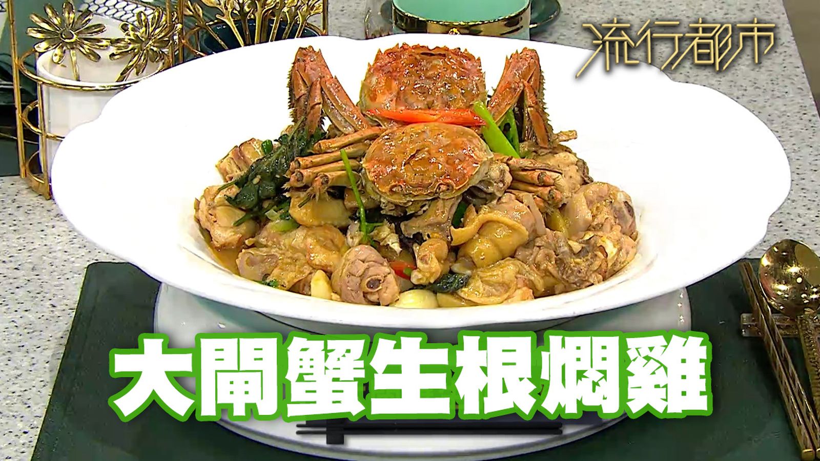 今集《流行都市》「睇餸食飯」環節有 三姐蕭秀香 教大家做「大閘蟹生根燜雞」 。![]()