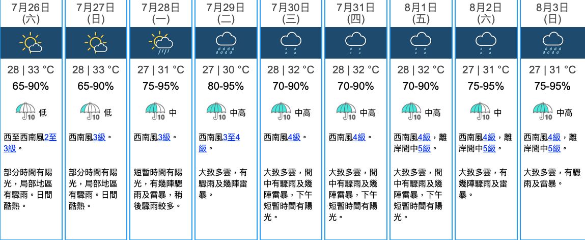 天文台在今日(7月25日)指,一道廣闊低壓槽會在未來兩三日影響南海中北部,其上可能有一低壓區於週末期間形成。但廣闊低壓槽會在下周中至後期逐漸向北移向華南沿岸,並為該區帶來驟雨。