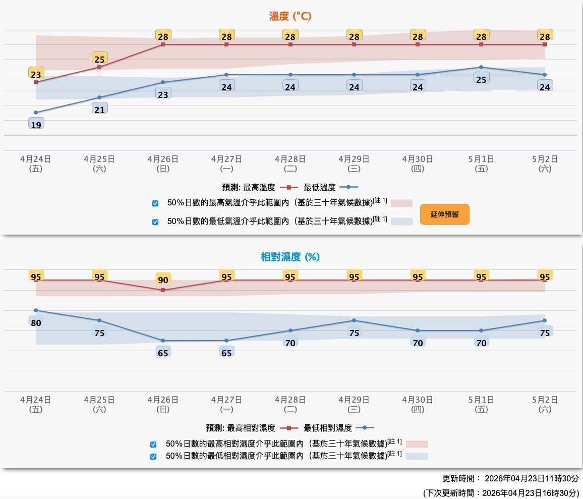 - 4月26日 (日) 氣溫23 | 28 °C、相對濕度65-90%:東風3至4級。 部分時間有陽光。
