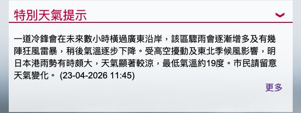 天文台今日(23日)發出特別天氣提示,預料一道冷鋒會在未來數小時橫過廣東沿岸,該區驟雨會逐漸增多及有幾陣狂風雷暴,稍後氣溫逐步下降,稍後氣溫逐步下降至午夜約23度。受高空擾動及東北季候風影響,明日(24日)本港雨勢有時頗大,天氣顯著較涼,最低氣溫約19度。市民請留意天氣變化。