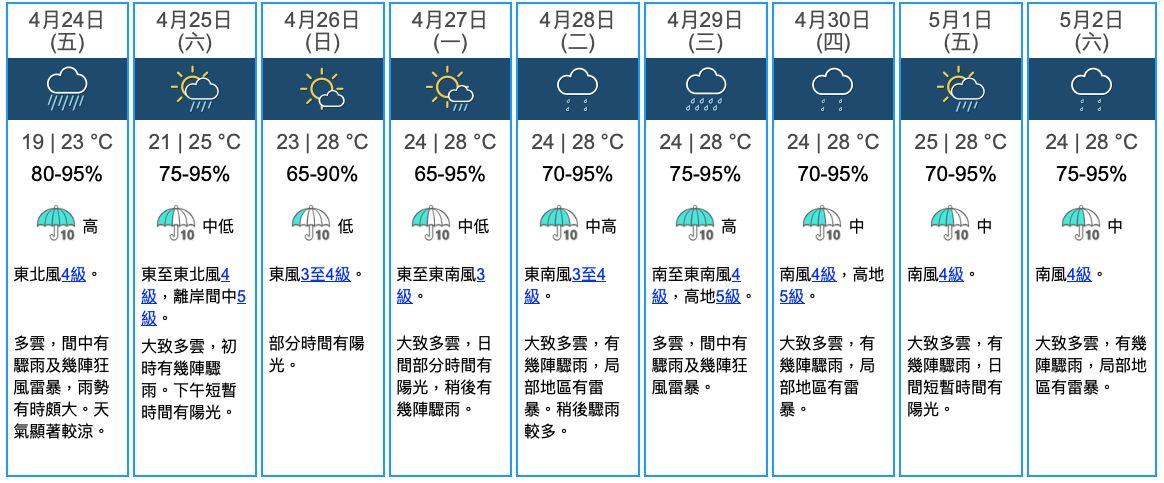- 4月24日 (五) 氣溫19 | 23 °C、相對濕度 80-95%:東北風4級。 多雲,間中有驟雨及幾陣狂風雷暴,雨勢有時頗大。天氣顯著較涼。