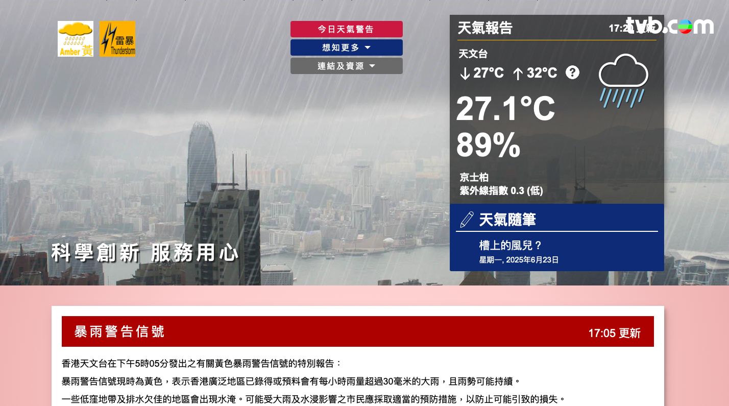 天文台於今日(6月26日)下午5時05分發出黃色暴雨警告信號。