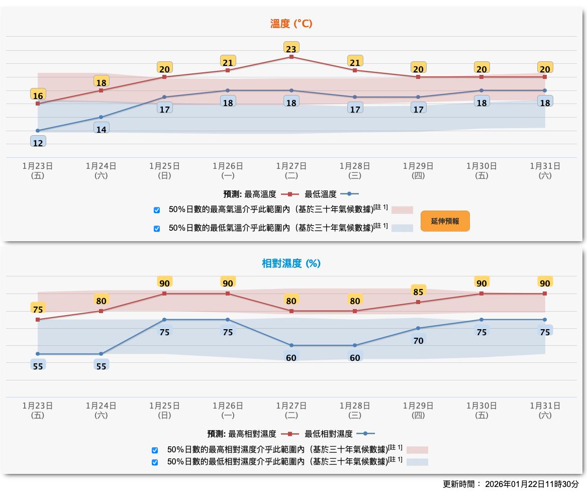 - 1月23日 (五)12 | 16 °C 55-75%:東北風3至4級。 大致多雲。早上寒冷,日間部分時間天色明朗及乾燥。