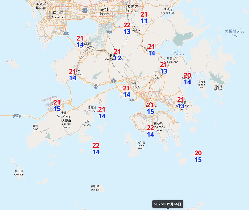 天文台預料,一道冷鋒會在星期六稍後橫過廣東沿岸,該區北風增強及有一兩陣雨,氣溫顯著下降。受隨後的東北季候風影響,下周初華南沿岸天氣乾燥,早晚清涼,內陸日夜溫差較大。在香港九天天氣預報中,12月14日(星期日)氣溫為15至20 °C,分區氣溫最低為11°C,大家出門要留意天氣!