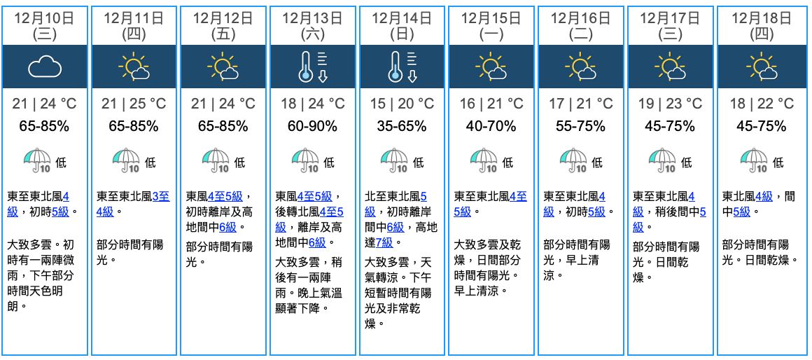 - 12月10日 (三) 21 | 24 °C 65-85% 12月10日(三)的顯著降雨概率預報是低 低 東至東北風4級,初時5級。 大致多雲。初時有一兩陣微雨,下午部分時間天色明朗。