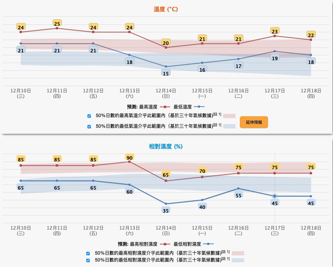- 12月16日 (二) 17 | 21 °C 55-75%:東至東北風4級,初時5級。 部分時間有陽光,早上清涼。