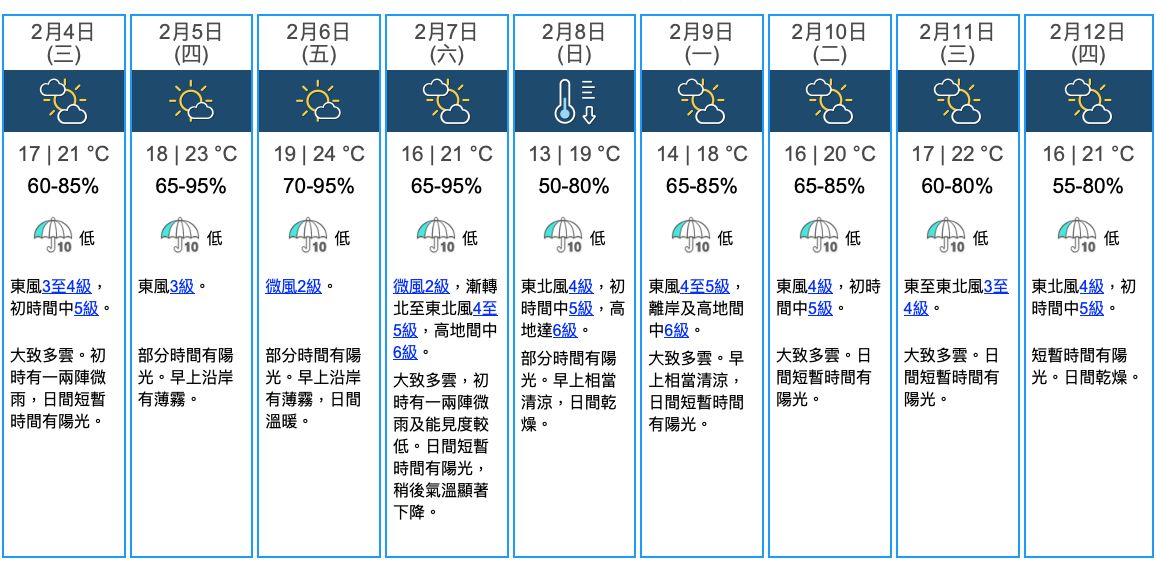 - 2月11日 (三) 17 | 22 °C 60-80%:東至東北風3至4級。 大致多雲。日間短暫時間有陽光。