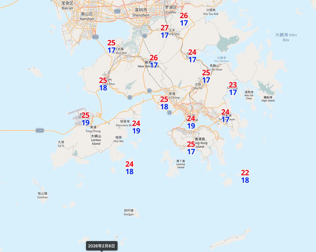 從香港九天天氣預報中可以看到,2月6日 (五) 最高氣溫為24 °C,分區最高氣溫為27°C;而2月7日 (六)氣溫顯著下降;2月8日 (日)最低氣溫是13 °C,分區最低氣溫為8°C。