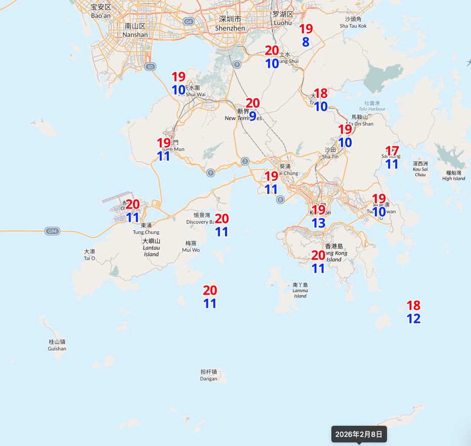 - 2月8日 (日)13 | 19 °C 50-80% :東北風4級,初時間中5級,高地達6級。 部分時間有陽光。早上相當清涼,日間乾燥。
