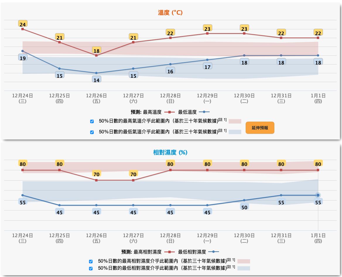所以12月24日 (三) ,即平安夜當日,氣溫為19至24°C;12月25日氣溫跌至15至21°C;12月26日最低氣溫為14°C,分區最低氣溫為10°C,最高氣溫為18°C;12月31日,即除夕當日,氣溫為18至22°C。