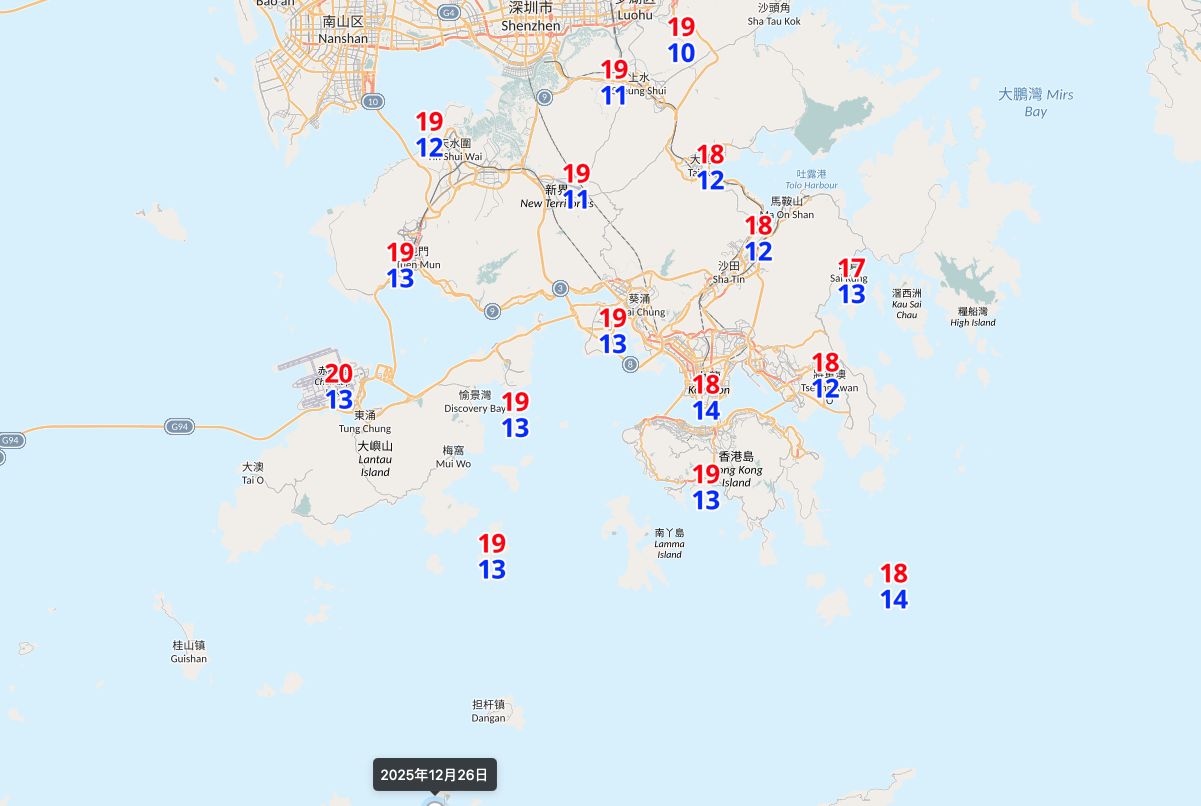 - 12月26日 (五) 14 | 18 °C :北至東北風4級,初時間中5級。 大致多雲及乾燥。早上相當清涼,日間部分時間天色明朗。