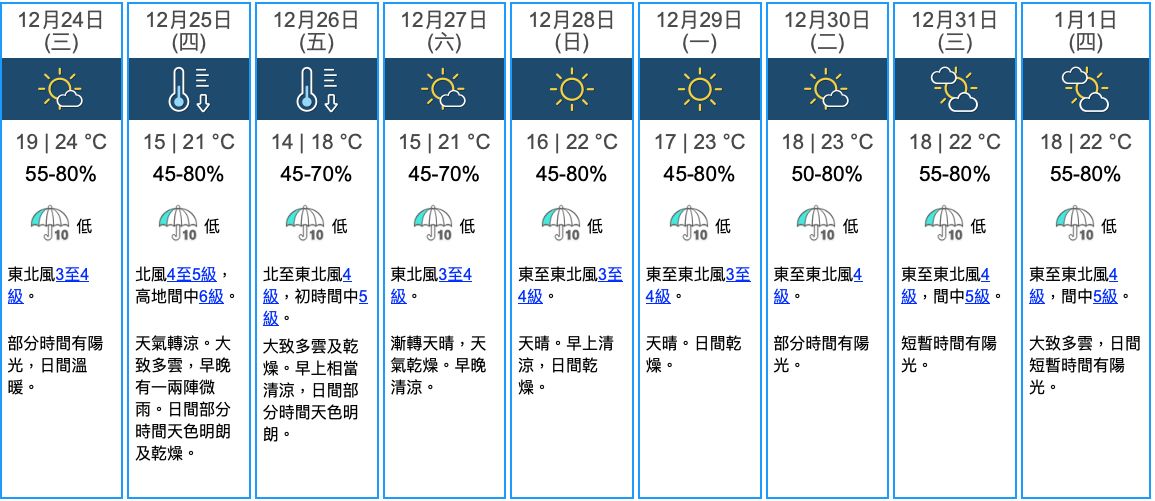 - 12月24日 (三) 19 | 24 °C :東北風3至4級。 部分時間有陽光,日間溫暖。