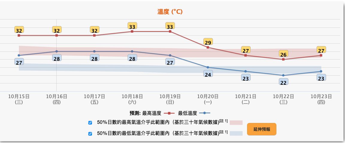 天氣|已到10月中,今日(14日)氣溫仍然炎熱,但從天文台的香港九天天氣預報中可以看到,下星期最低氣溫有機會降至22°C,即睇9日天氣!