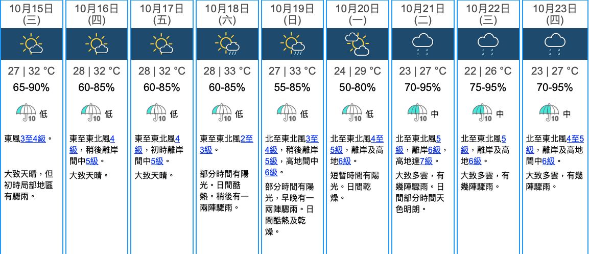 - 10月19日 (27 | 33 °C) :北至東北風3至4級,稍後離岸5級,高地間中6級。 部分時間有陽光,早晚有一兩陣驟雨。日間酷熱及乾燥。