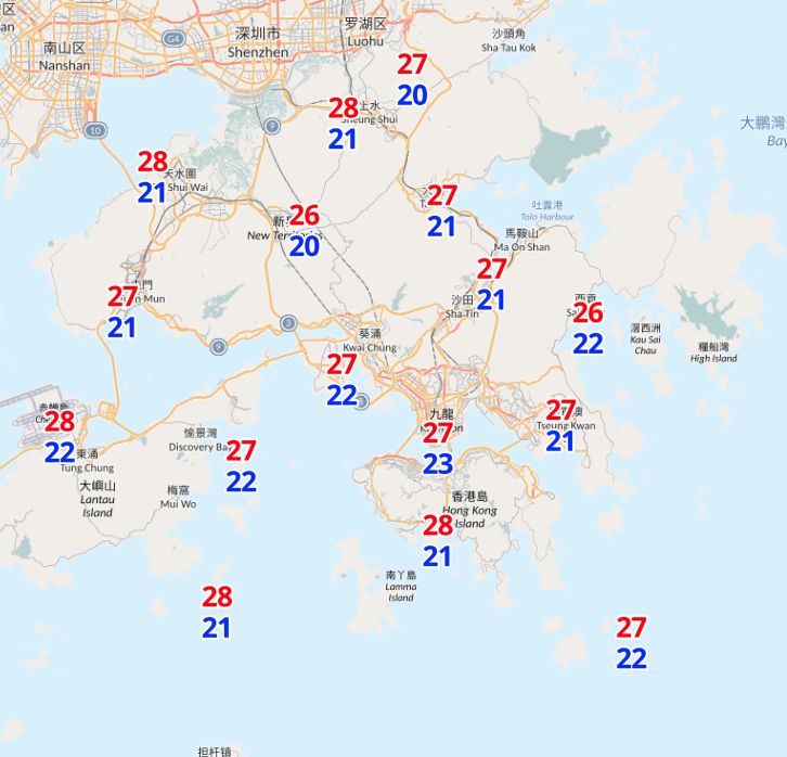 - 10月22日 (22 | 26 °C) :北至東北風5級,離岸及高地6級。 大致多雲,有幾陣驟雨。