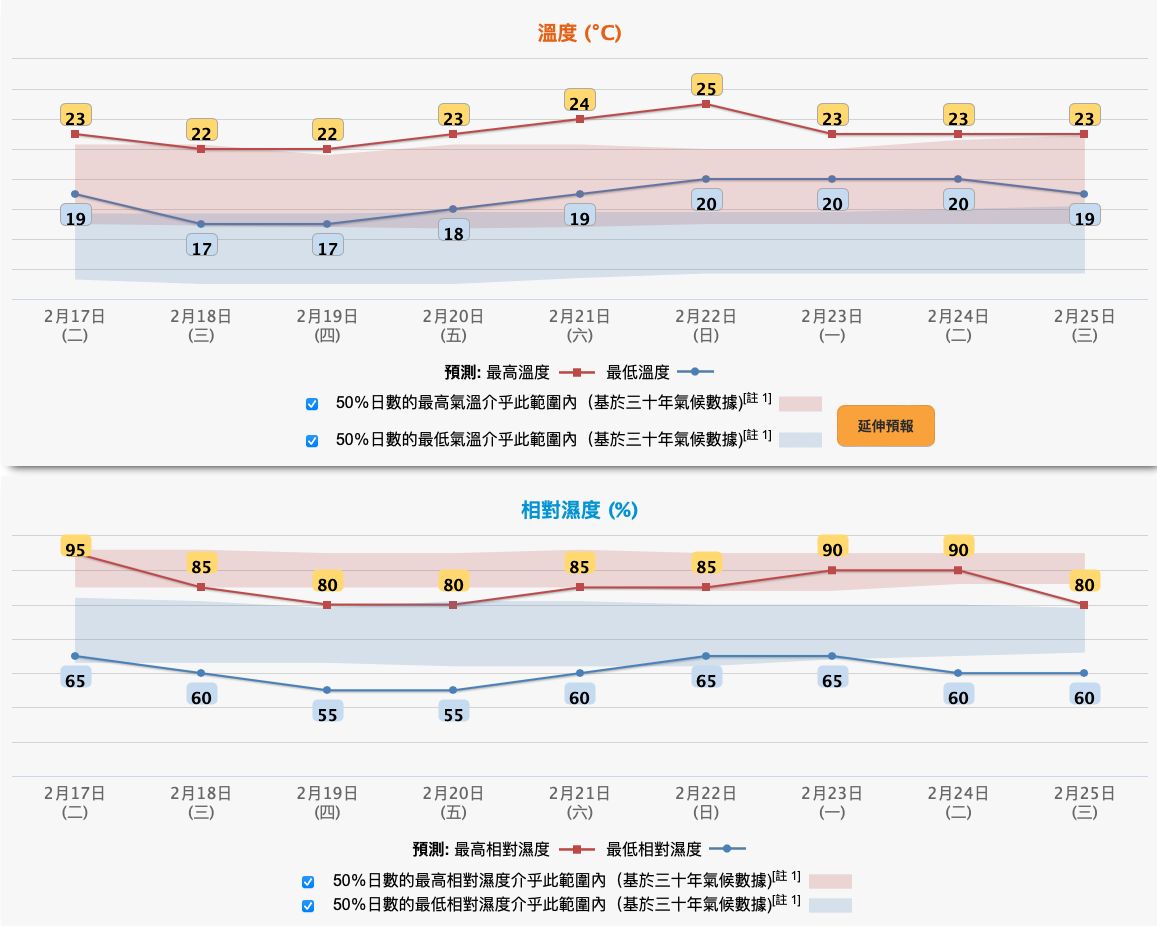 - 2月22日 (日) 20 | 25 °C 65-85%:東至東北風2至3級。 部分時間有陽光,日間溫暖。