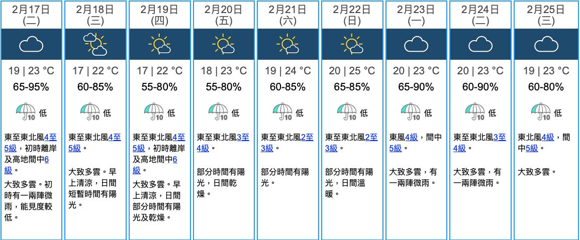 - 2月17日 (二) 19 | 23 °C 65-95%:東至東北風4至5級,初時離岸及高地間中6級。 大致多雲。初時有一兩陣微雨,能見度較低。