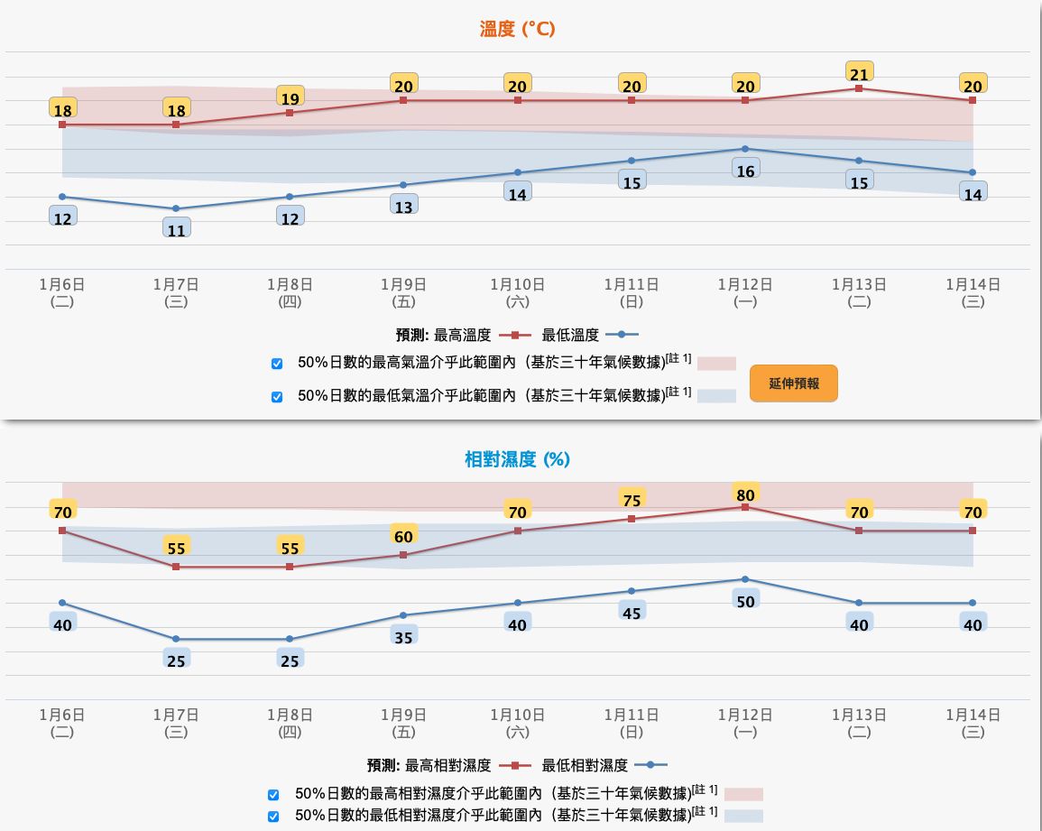 可以看到1月6日 (二) 最低氣溫為12°C,而1月7日 (三)最低氣溫更跌至11°C,周三分區最低氣溫只有6°C。