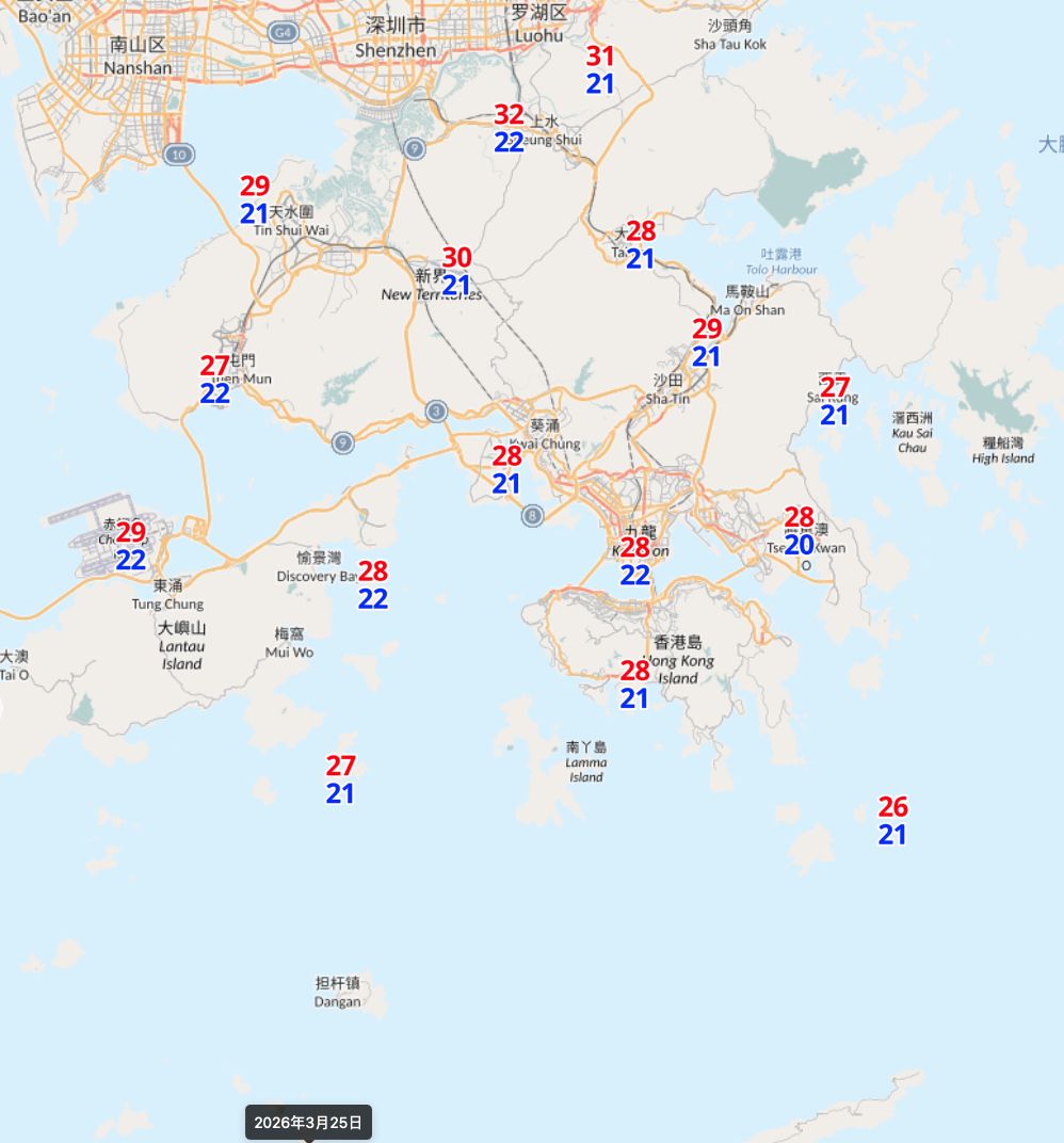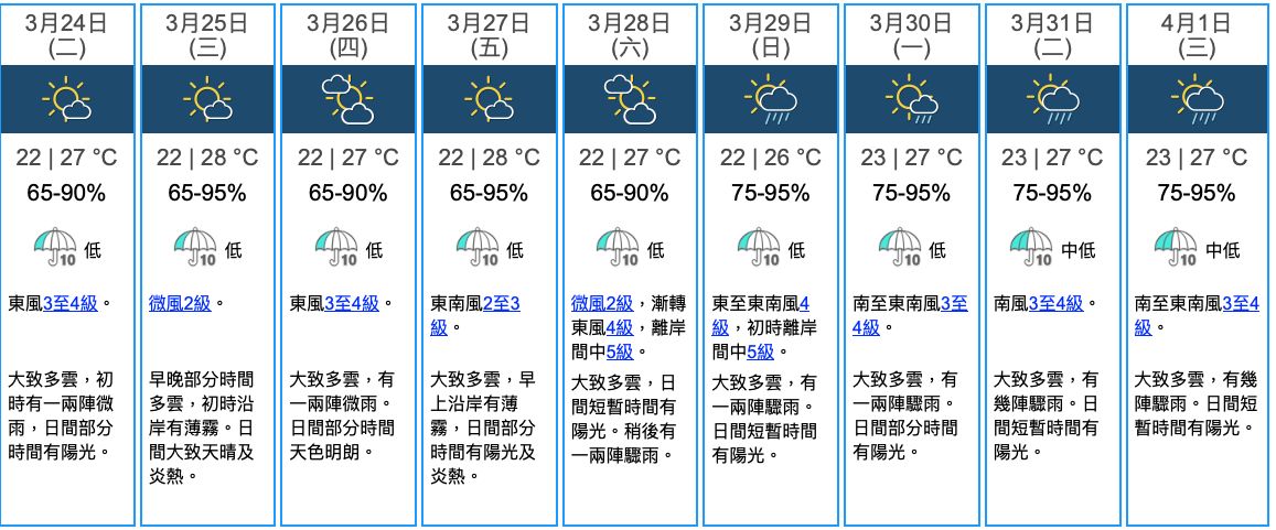 3月26日 (四) 22 | 27 °C 65-90%:東風3至4級。 大致多雲,有一兩陣微雨。日間部分時間天色明朗。