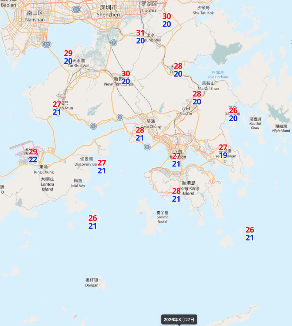 3月27日 (五)22 | 28 °C 65-95%:東南風2至3級。 大致多雲,早上沿岸有薄霧,日間部分時間有陽光及炎熱。
