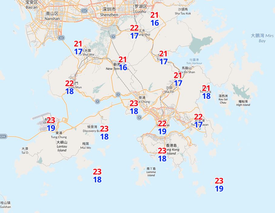天文台指,明日(22日)風勢仍然頗大,海有大浪及湧浪,市區最低氣溫在19°C左右,新界再低兩三度。