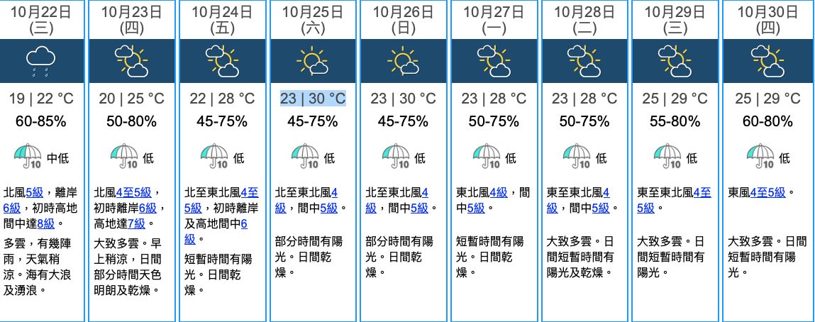 - 10月25日 (六) 23 | 30 °C:北至東北風4級,間中5級。 部分時間有陽光。日間乾燥。