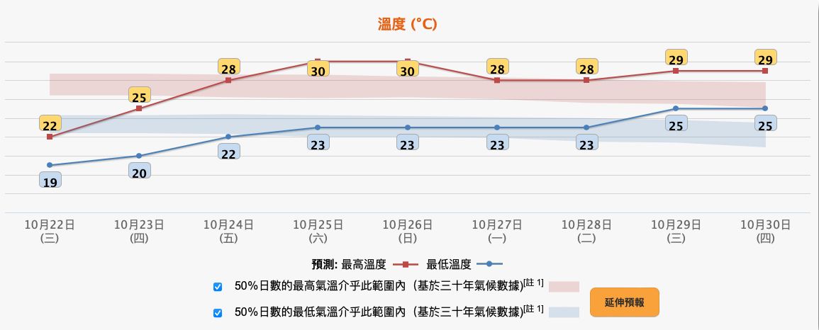 根據天文台的九天天氣預報,星期四的氣溫開始回升,10月25日及10月26日的氣溫為23至30°C,大家要留意了!即睇九天天氣預報: