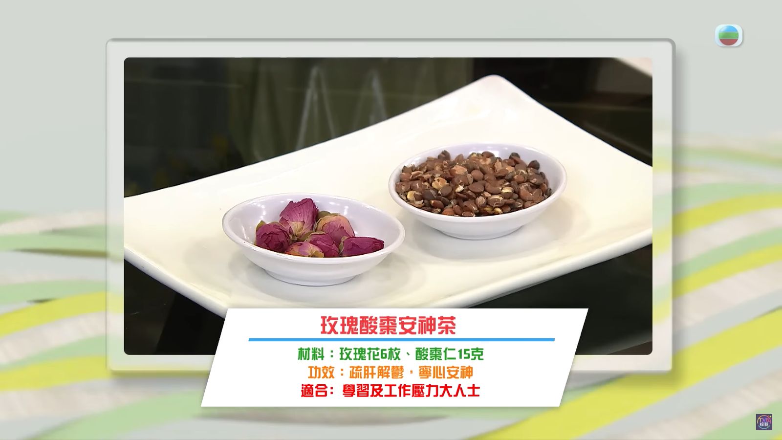 材料:玫瑰花6枚、酸棗仁15克(煲30分鐘)