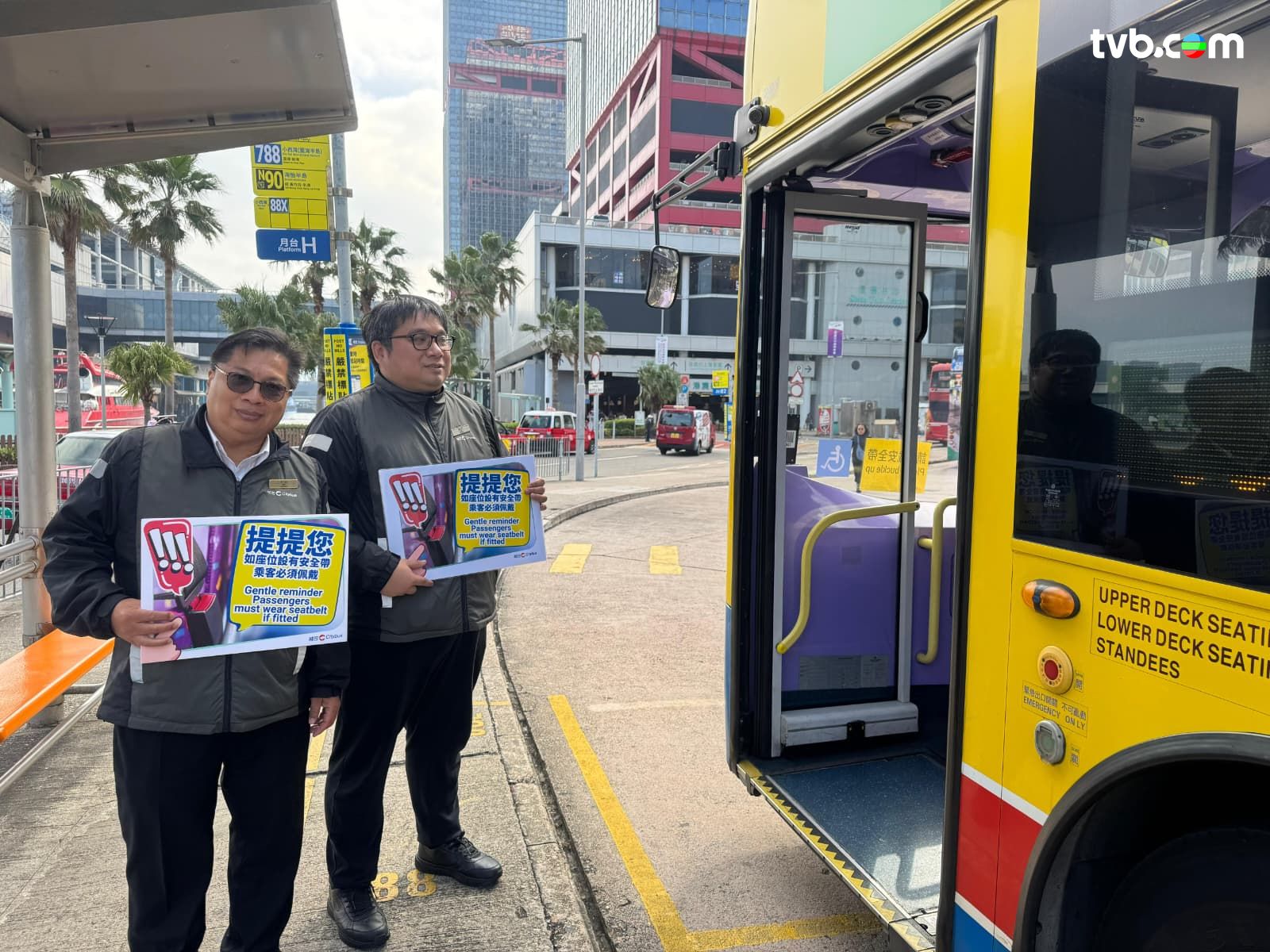 佩戴安全帶新法例已於本年1月25日正式生效。法例執行首日(25日)城巴全面加強宣傳與執法配合,不僅於主要總站、口岸及機場派員提醒乘客,更在全線巴士擋風玻璃增設特別告示。城巴指出,目前旗下約800輛巴士已於全車或上層座椅安裝安全帶,並會定期進行保養檢查;同時,公司已向車長發放內部指引及處理建議,並在車廂智能系統加入廣播功能,讓車長能適時提醒乘客履行法例義務。