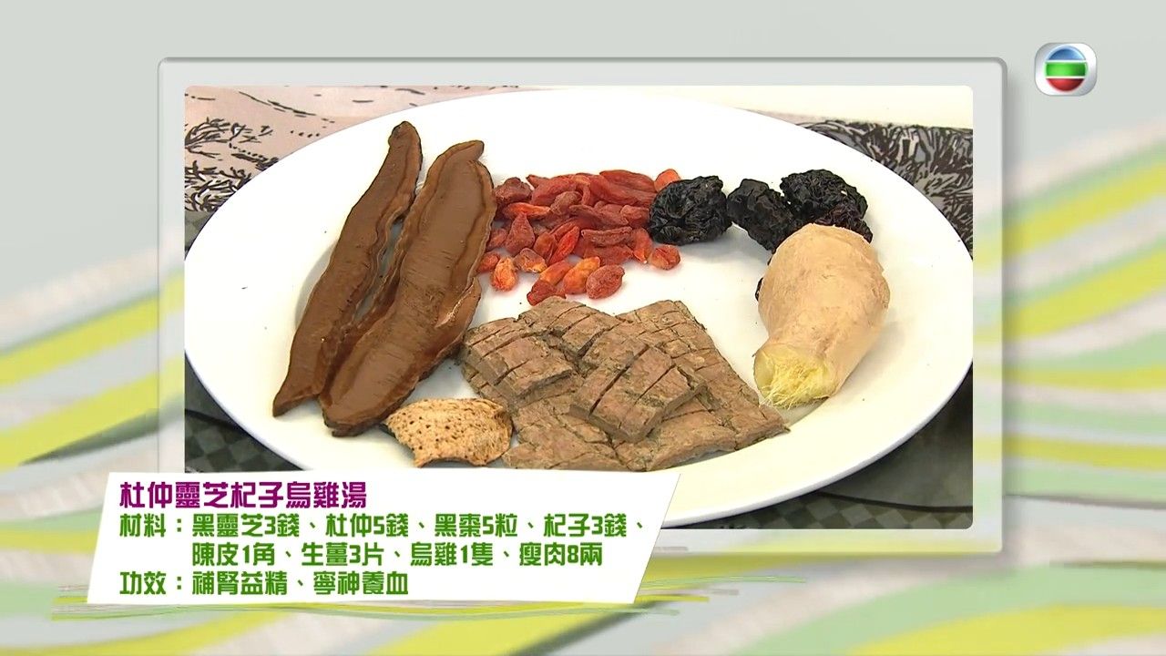 材料:黑靈芝3錢、杜仲5錢、黑棗5粒、杞子3錢、陳皮1角、生薑3片、烏雞1隻、瘦肉8兩