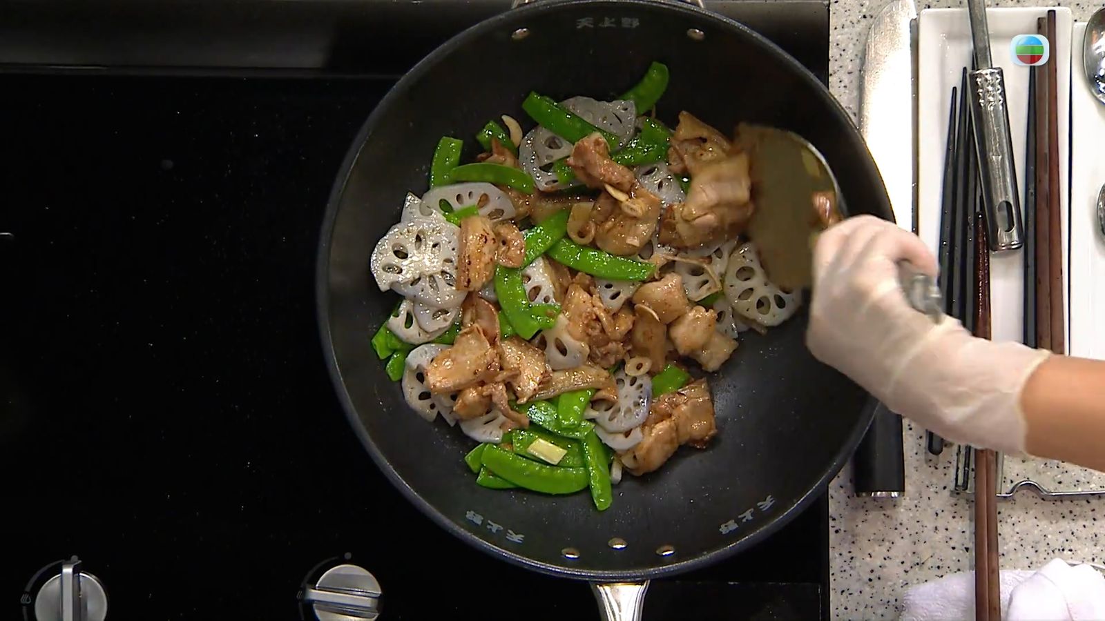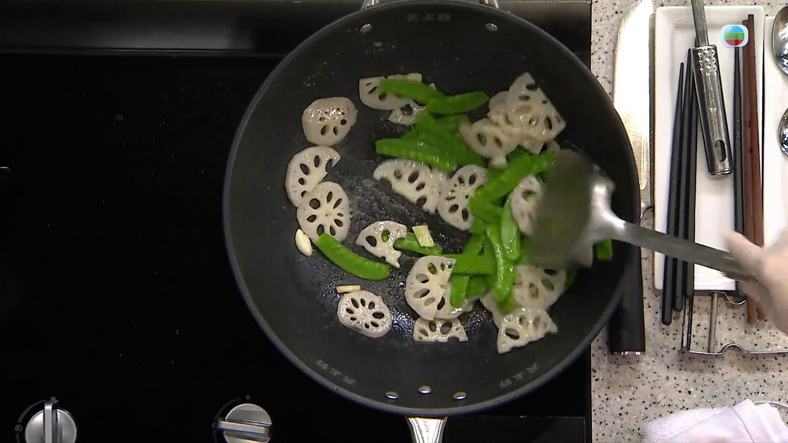 起油鍋先炒蓮藕片,再下荷蘭豆略為兜炒,盛起備用。