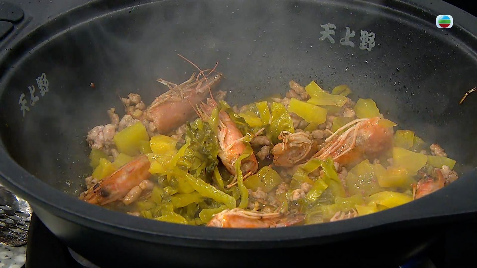 開蓋取出蝦頭,用蠔油、生抽調味,然後再加腐竹、韭菜,之後放入米線、蝦仁同煮3至4分鐘。