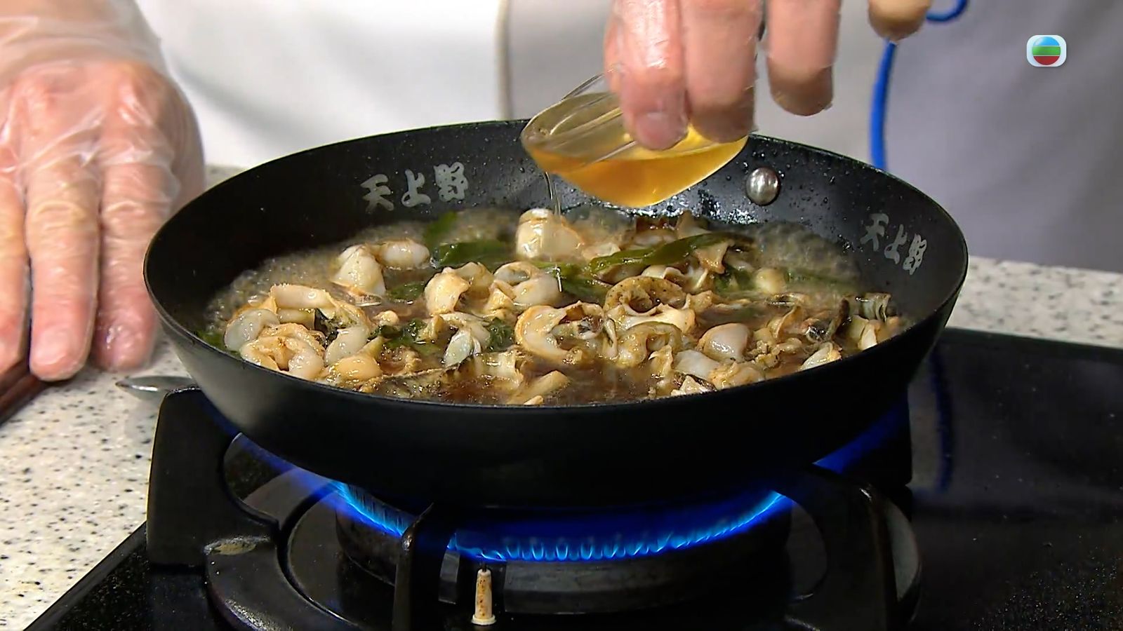 7.蒸金蠔剩下的薑片、蔥段下鍋,注入清水,以大火煮沸,下蠔油煮勻,加入帆立貝裙邊、味醂、糖、胡椒粉,注入生粉水煮成芡汁。