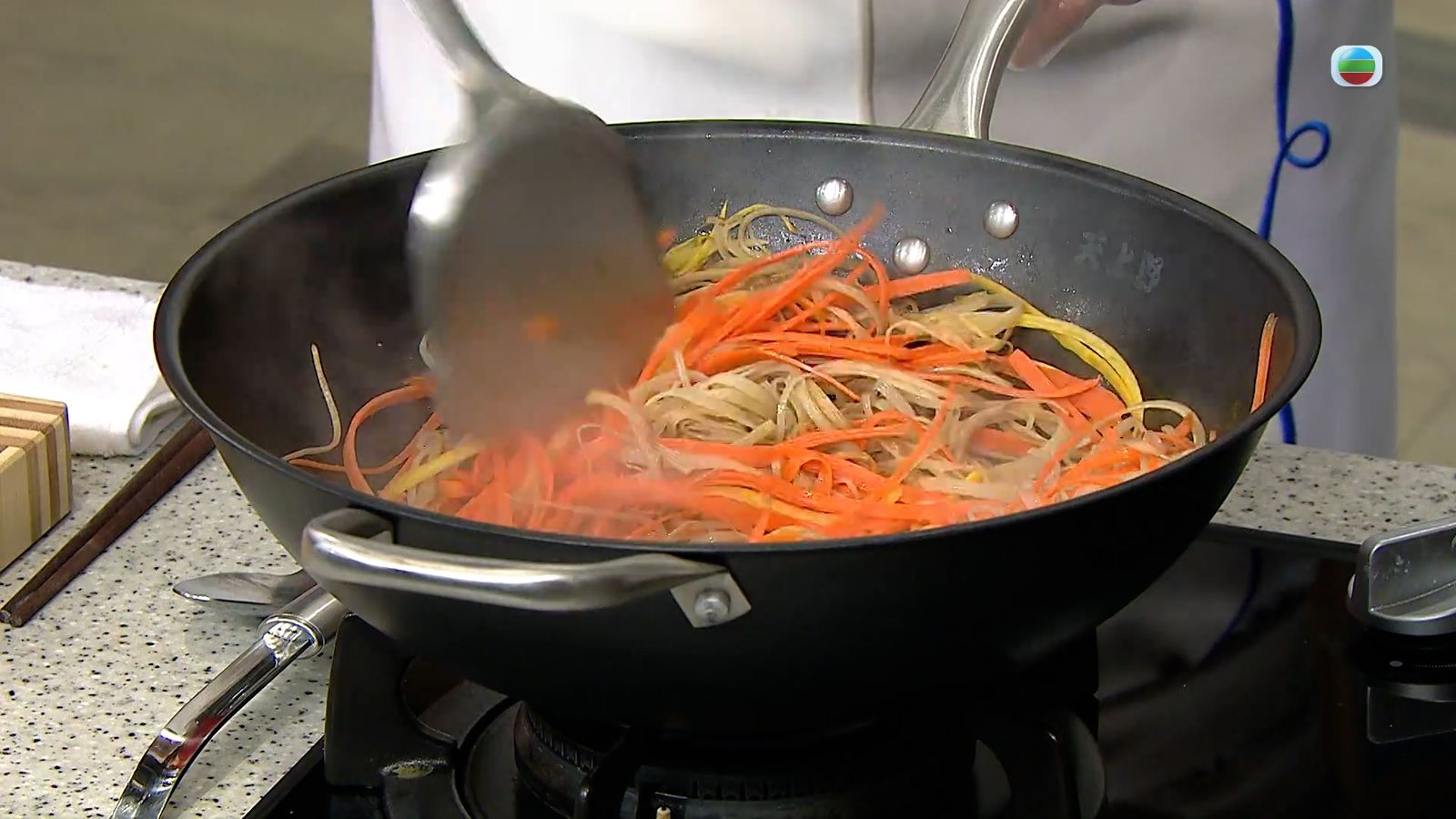 2.起油鍋,下薑絲、牛蒡絲、甘筍絲、鹽,將鍋中材料炒至軟身。