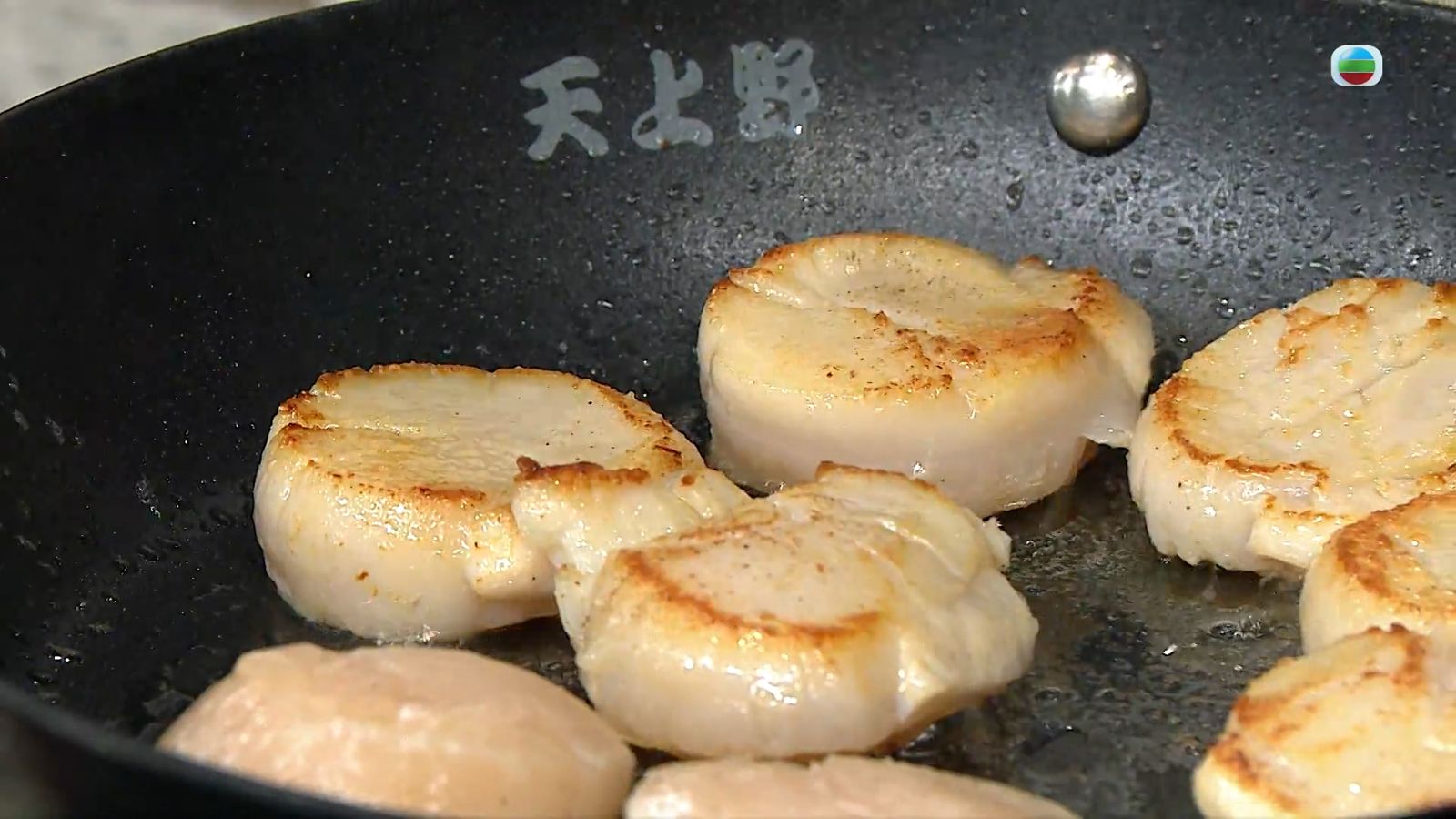 帆立貝去掉殼和裙邊,殼和裙邊留用。帆立貝下鹽、胡椒粉,再拍上生粉後下油鍋兩面煎香備用。
